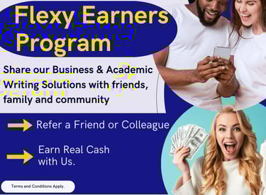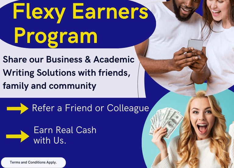 Discover how you can become a Flexy Earner with us by simply referring any of our Business, Academic, or Technical Writing Solutions to families, friends, and colleagues. Terms & Conditions Apply.