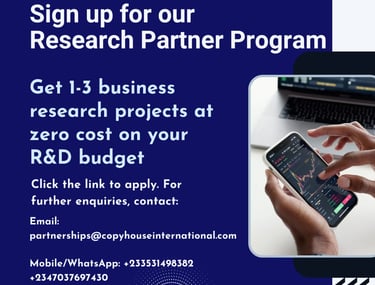 The research client partners program offers you, as a registered business startup or SME, the unique opportunity to have 1 to 3 of your business research needs handled by Copy House International at no cost to your budget. This initiative is designed to foster mutually beneficial collaborations, allowing our partners to access valuable insights and research without financial strain. By engaging in these projects, client partners not only enhance their understanding of key market dynamics but also gain the potential for significant advancements in their strategic decision-making while contributing to our portfolio expansion in the amplification of our brand to their communities. We believe that this offering will create a win-win scenario, paving the way for innovative projects that benefit both parties involved.